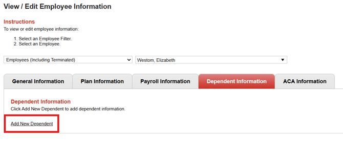 1. From the main menu bar, select Employees, then View/Edit Employees, then Dependent Information.