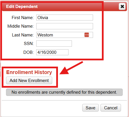 5. Enter the covered individual's First Name, Last Name, SSN and/or DOB then select Add New Enrollment.