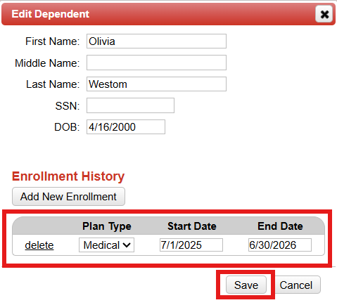 Note: An employee must be enrolled in the medical plan to enable the addition of covered individuals. |