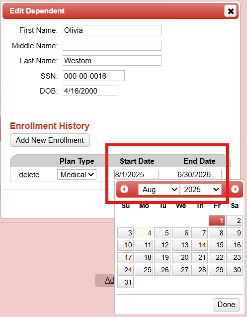 5. Select the current start date and/or end date effective date fields to make the date adjustment then select Save.
