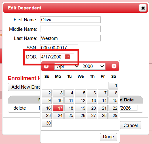 5. In the date of birth field update as required then select Save.