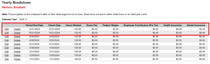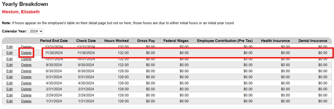 5. Review to locate the check date which requires deletion, select the Delete next to that row, check date 11/30/2024 as an example.