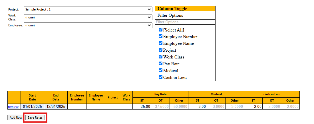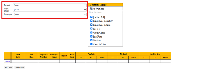 - Assign rates by project, work class, employee, or a combination of the three. When selecting filters, assigned rates can populate on certified payroll reports. In the Project, Work Class, or Employee drop down box, select the filter/filter's for the rate set.