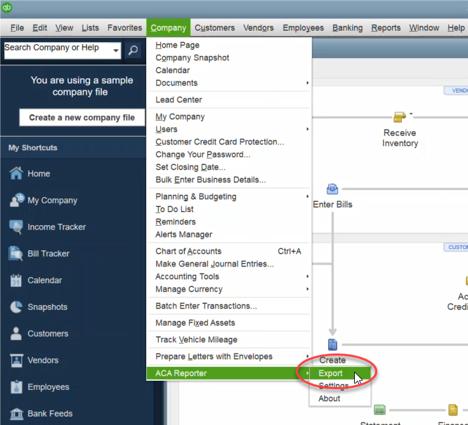The ACA Reporter QuickBooks plug-in must be installed before setup and payroll data export for use with ACA Reporter.